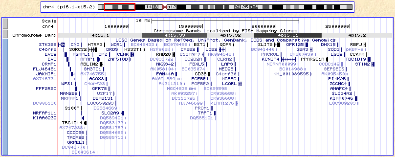 9. Type (or copy/paste from here) 4p16.1;4p15.2 into the position/search box. If you copy/paste the 4p16.1-4p15.2 directly from the report, you must change the hyphen to a semicolon. The Gateway page gives examples of this and other search terms that work. Hit the jump button. (22.7 Mb). This turns on the Chromosome Band track automatically.