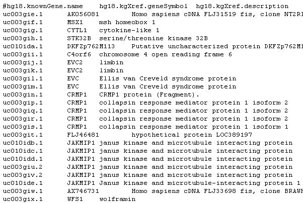 You might also be interested in chrom, txStart and txEnd in the knownGene table, but we won't select them right now.